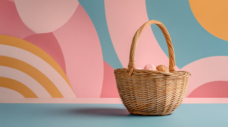 This image features a woven basket filled with colorful eggs, set against a vibrant and abstract pastel background, perfect for spring and Easter themes.