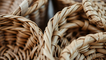 Explore the intricate details of natural fiber weaving in this stunning close-up photograph, showcasing the rich textures and patterns of handmade craftsmanship.