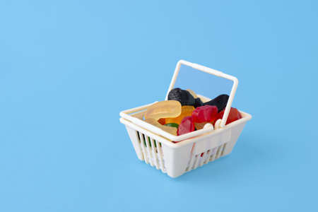 sweet and tasty candy - marmalade, jelly candies, in the toy food basket, shopping trolley on a blue background with space for text