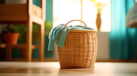 Generative AI : Bamboo basketwork garbage bin on the floor in a room