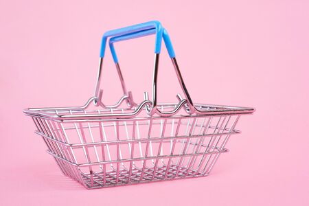 Empty metal shopping basket. Concept of consumerism, shopping symbol. Copy space trend pastel color. Hard shadows, morning light.
