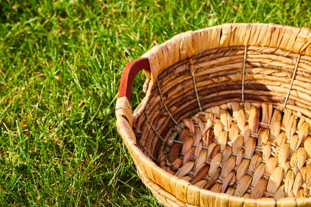 Empty wicker basket on wooden background. Close up. Selective focus.