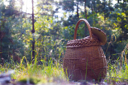 Woven wood picnic basket on small wooden table in park. Summer sunny day and picnic time concept