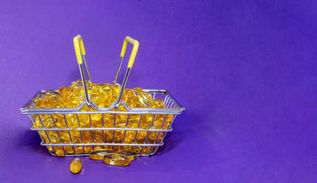 Close up of metal grocery basket for shopping in supermarket with lowered handles and yellow plastic elements isolated on blue background. Concept of shopping. Copy space for advertisement.