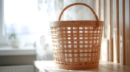 This image showcases a beautifully crafted wooden basket placed on a table, illuminated by soft natural light that enhances its aesthetic appeal and cozy atmosphere.