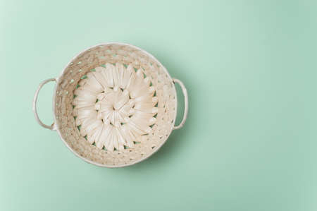 Round empty wicker straw basket with handles on light green background. View from above. Decorative interior items. Copy space
