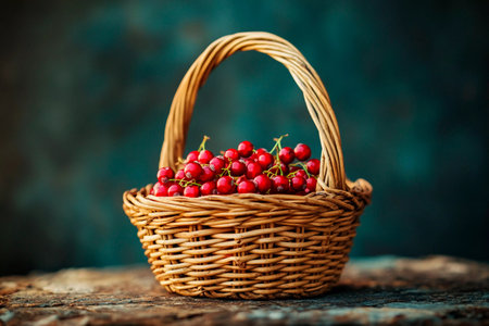 A wicker basket filled with vivid red berries sits on a wooden surface. The backdrop features a textured blue hue, creating a warm and inviting atmosphere perfect for showcasing fresh produce.