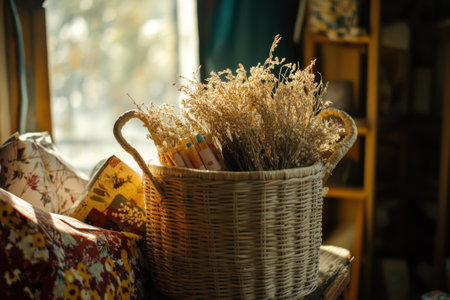 A wicker basket holds dried flowers and neatly arranged colorful pens, creating a warm atmosphere in a cozy room.