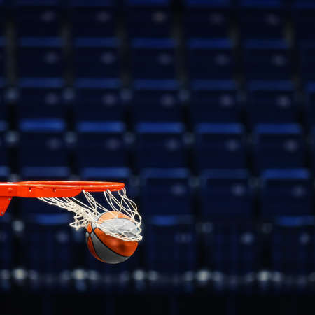 Basketball hoop with a ball on the background of the empty seats of the sports arena