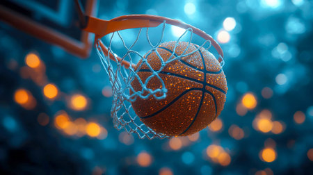 A dramatic shot of a basketball swishing through a hoop, covered in glistening water droplets. Warm glowing lights create an energetic atmosphere.