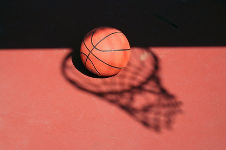 A Basketball and net shadow on a red court