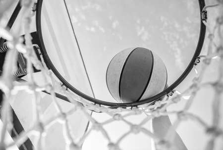 ball entering in a basketball hoop with the sky in the background, concept of urban sport outdoors, copy space for text