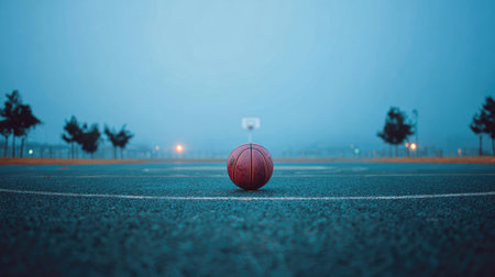 A solitary basketball rests on a court, enveloped in mist during an evening setting. The image conveys a serene yet inviting atmosphere perfect for sports enthusiasts.