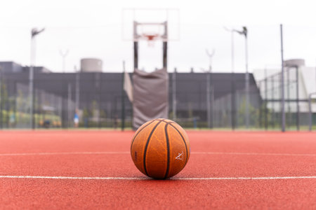 A vibrant basketball sits on an outdoor court, capturing the essence of sports and leisure. The hoop stands in the background, inviting play and competition.