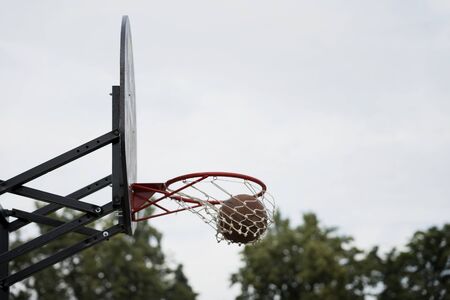 Street basketball game. Basketball shield, ball going through basket on background of sky, trees. Concept of sport, hit accuracy, active lifestyle