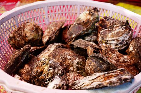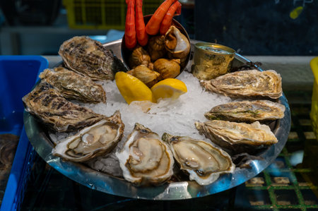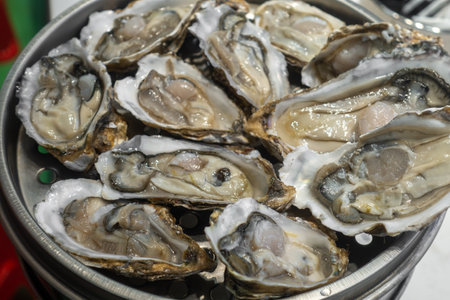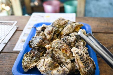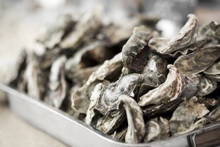 Street food festival of mediterranean food. Close up of fresh oysters in big plate for sale outdoor