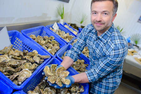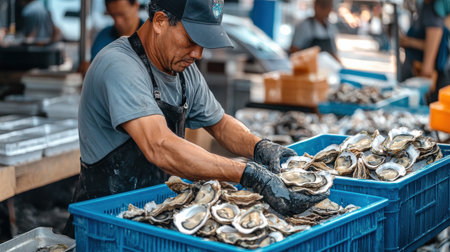 A fisherman preparing fresh oysters for sale, prized for their flavor in the gourmet seafood market