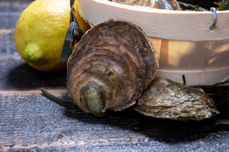 Fresh raw European flat oysters grown in Brittany in Belon river, France, close up