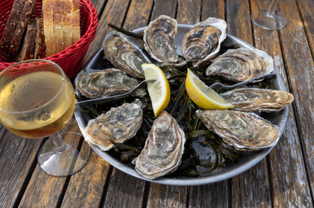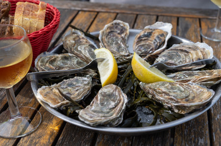 Plate with fresh live raw oysters seashells with citron, bread, butter and white wine served at restaurant in oyster-farming village, Arcachon bay, Gujan-Mestras port, France