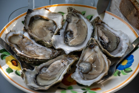 Eating of fresh big raw fine de claires vertes green french oysters from Marennes-Oleron, top view