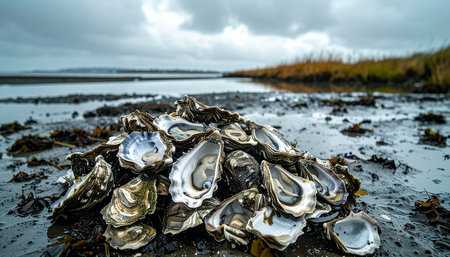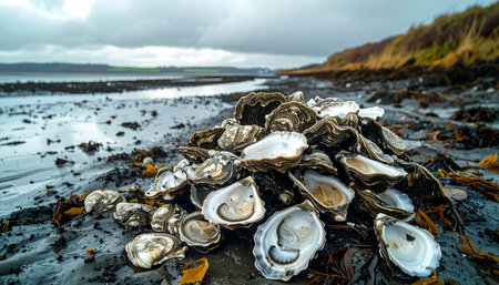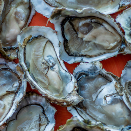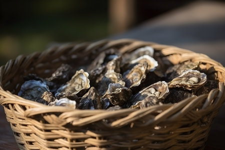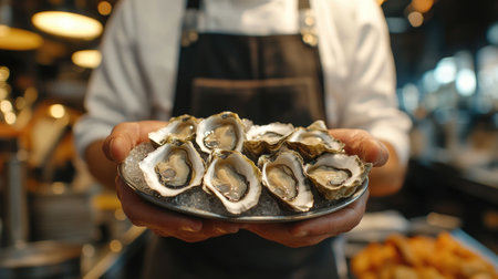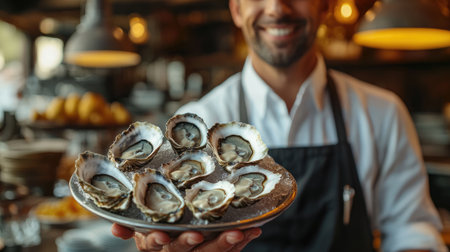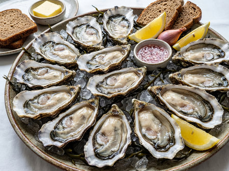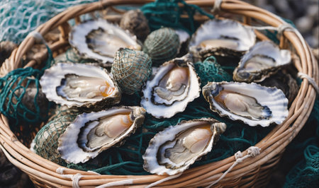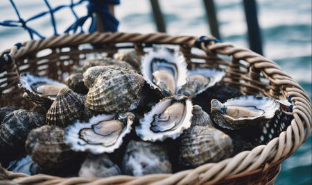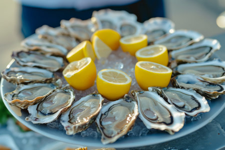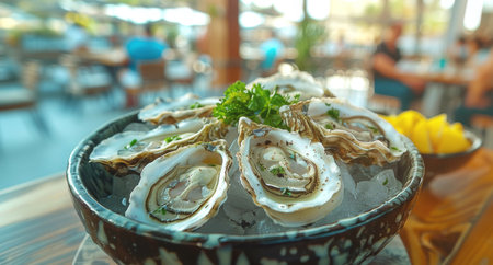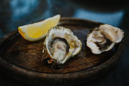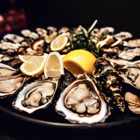 A delicious food composition featuring succulent oysters. Gourmet seafood photography on display