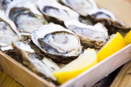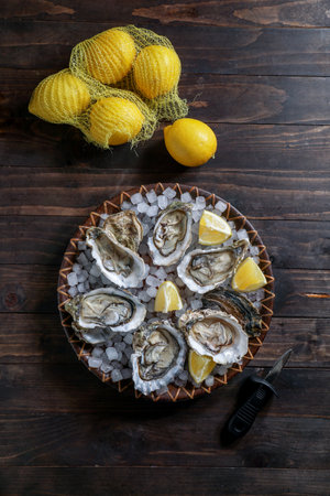 Fresh Raw Oysters on Ice with Lemon Wedge Served in a Wooden Platter Perfect for Gourmet Seafood Dish, Restaurant Menu or Elegant Dinner Table