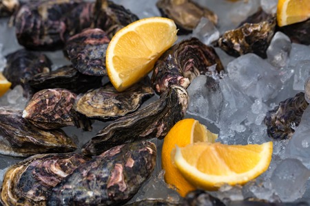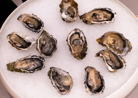 Fresh creuze cancale raw oysters shellfish on ice on market