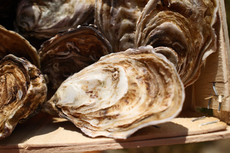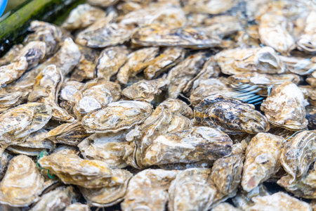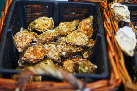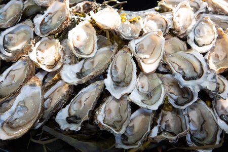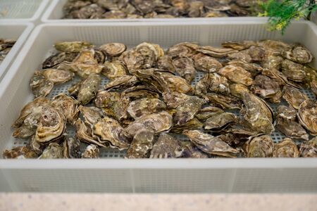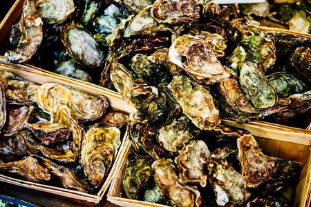 Oysters on the counter in wooden boxes on the market. Oysters for sale at the seafood market. Fish market stall full of fresh shell oysters. Fresh oysters selective focus. Close up shot.
