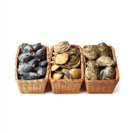 A visually appealing collection of fresh shellfish featuring mussels, clams, and oysters arranged in woven baskets on a clean white background.