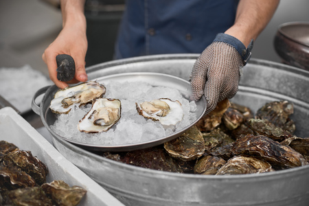 A man shucking a fresh oyster with knife and stainless steel mesh oyster glove for sale at the seafood market.Ready for eat or serving, Selective focus. Oysters are protein rich and raw with lemon.