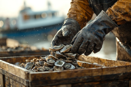 A close-up of a farmer harvesting oysters from a bed, preparing them for the seafood market