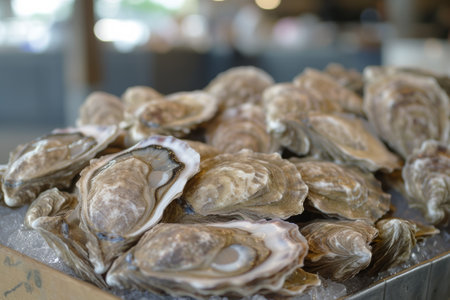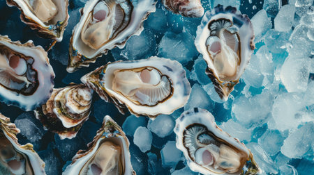 Fresh oysters on ice, viewed from above. Ideal for seafood markets or restaurants