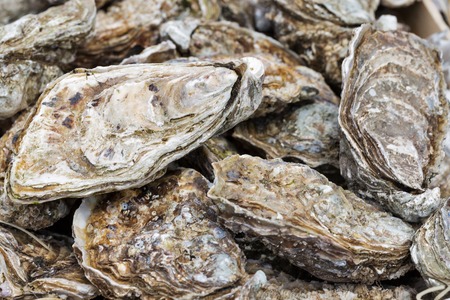 Big fresh oysters on ice. Seafood. Sale of oysters at a seafood market in Ostend, Belgium. Close-up.