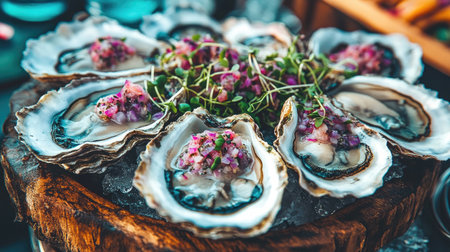 A beautiful arrangement of fresh oysters served on a wooden platter, garnished with vibrant toppings. Perfect for culinary enthusiasts and seafood lovers.