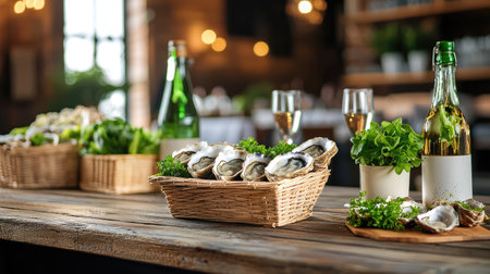 A captivating display of fresh oysters arranged on a rustic wooden table, complemented by sparkling wine and green garnishes in a cozy restaurant.