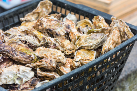 Fresh catch of raw oysters in wooden box at retail display of fisherman market, close up, high angle view