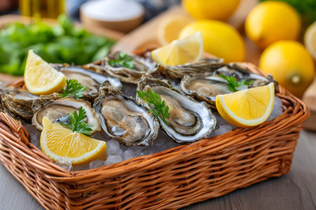 Fresh oysters garnished with lemon and parsley are served on ice in a wicker basket, ready to be enjoyed