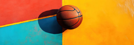 A single basketball rests on a vibrant outdoor court, surrounded by colorful triangular patterns and textures, creating an energetic and dynamic sports environment.