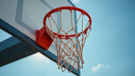 The bright basketball hoop hangs against a serene blue sky, its net gently swaying in the breeze, inviting players for a friendly match or practice on a warm afternoon.