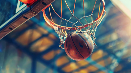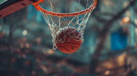 Close-up of a basketball hitting the basket against a bokeh background. Sports event concept. Generative AI.