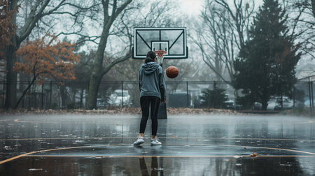 Young woman playing basketball on a rainy day in the park. Sport and recreation concept.