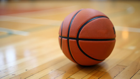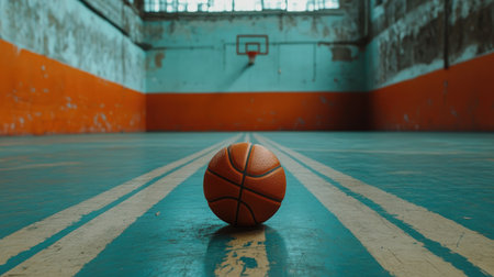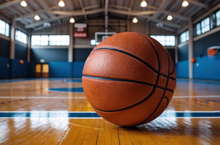 A vibrant basketball rests on the polished hardwood floor in an empty gymnasium, highlighting a serene yet energetic atmosphere ready for game day.
