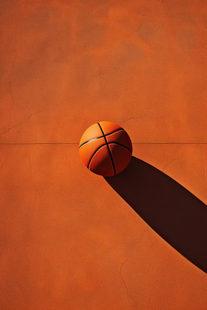 A vibrant basketball rests on a wooden floor, illuminated by dramatic light and shadows. This image captures the essence of sport, energy, and motion, perfect for athletic themes.
