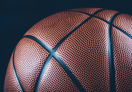 Sports props, close up of basketball ball against a dark background