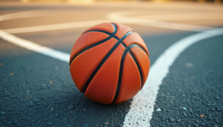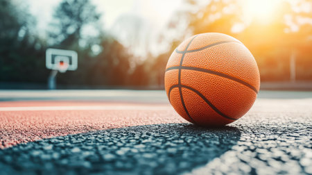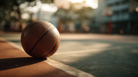 A vibrant close-up of a basketball placed on the court, capturing the essence of outdoor play as sun sets in a lively urban park, promising excitement and activity.