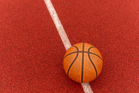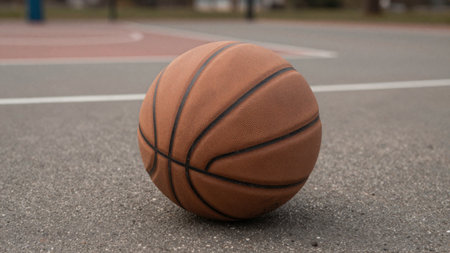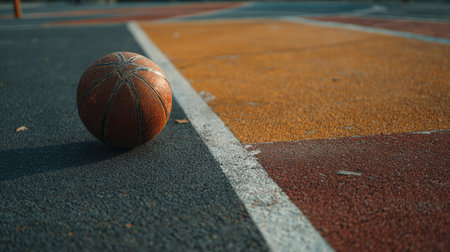 This captivating image features a close-up of a worn basketball resting on the court surface, representing the spirit of outdoor sports, community interaction, and active lifestyles.