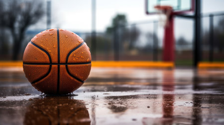 Wet Basketball on a Rainy Court with Hoop in the Background. Generative AI.