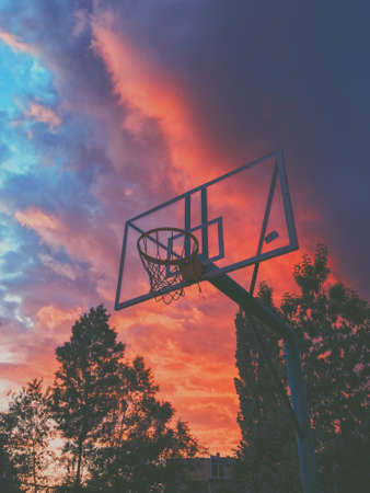 Captivating image of a basketball hoop framed against a vivid sunset sky, with sunlight filtering through the net, symbolizing playfulness and outdoor activity.