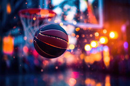 Basketball in mid-air near hoop, highlighting the thrill of outdoor sports under bright lights.