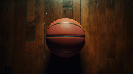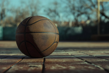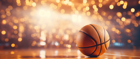 Basketball on hardwood court floor with natural lighting. Workout online concept. Horizontal sport theme poster, greeting cards, headers, website and app